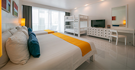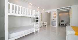 Description : Size is 60 square-meter. This room type is located on 2nd and 3rd floor of Serene Wing, every room has one bunk bed placed in room with Modern decoration. Indoor bathtub separated from shower, hot & cold water, tea & coffee making facilities. One bedroom with one bathroom.